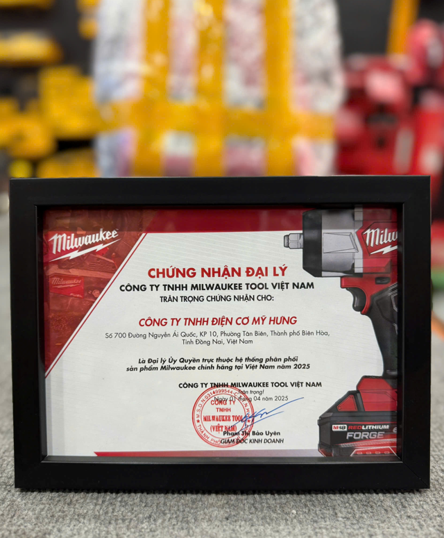Công ty TNHH Điện Cơ Mỹ Hưng tự hào là đại lý ủy quyền chính thức của Milwaukee tại Việt Nam, được chứng nhận phân phối các sản phẩm chính hãng năm 2025. Chúng tôi cam kết mang đến cho khách hàng những sản phẩm Milwaukee chất lượng cao, đầy đủ VAT, CO-CQ, cùng dịch vụ tư vấn và bảo hành chuyên nghiệp. Đây là minh chứng cho sự uy tín, minh bạch và trách nhiệm của chúng tôi với khách hàng và đối tác.